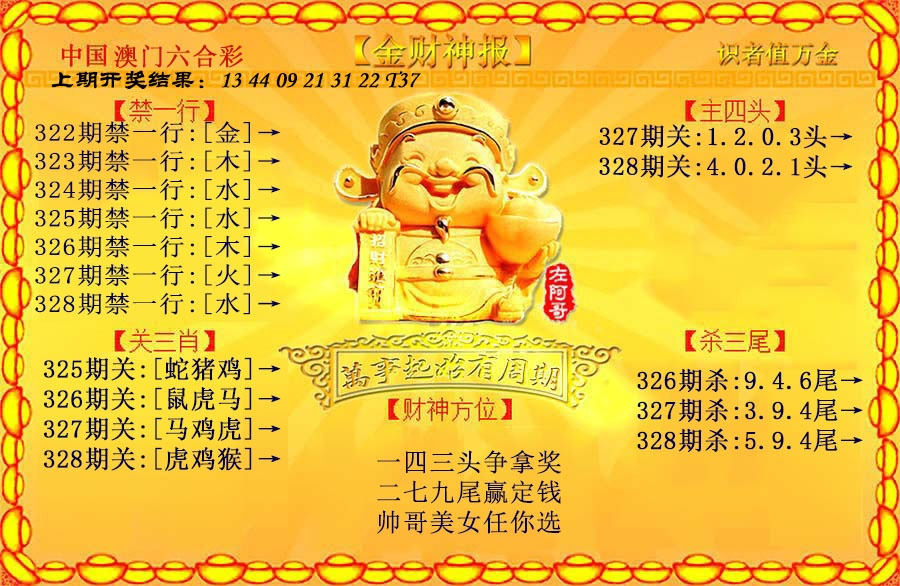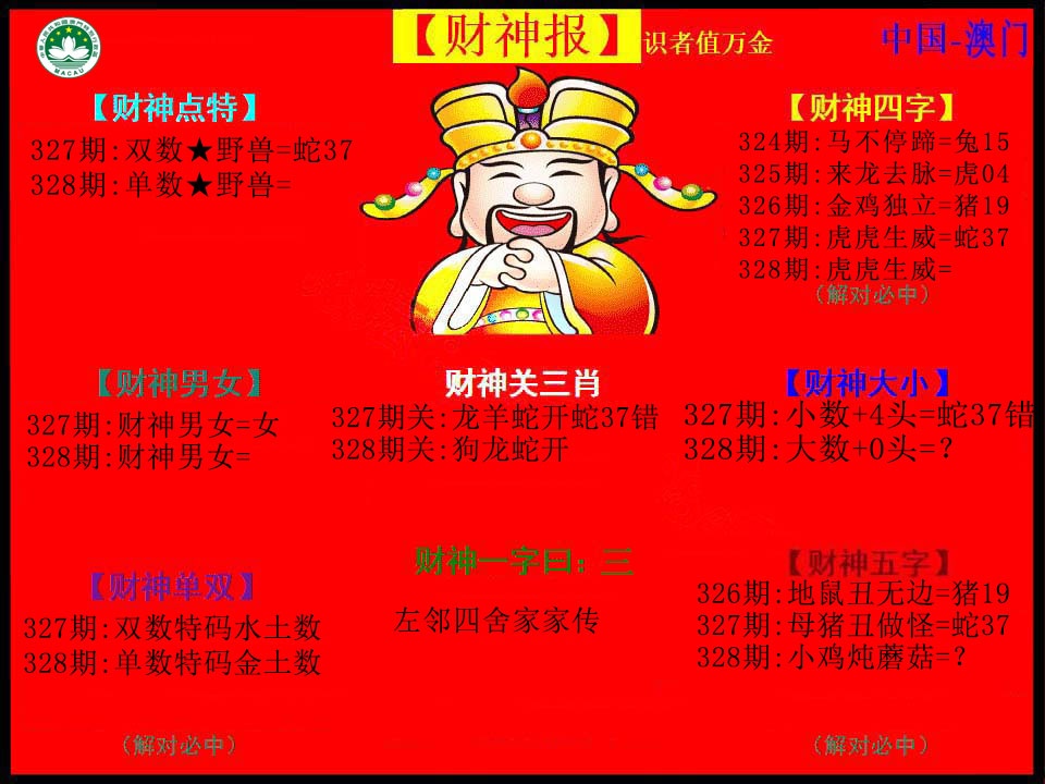 | 327期:半波特码【蓝单】开:蛇37准 |