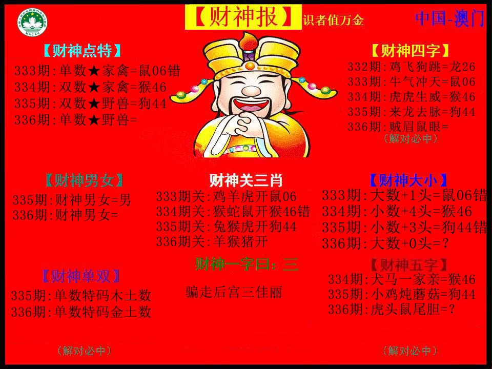 | 334期: 买啥都中 【野兽野兽野兽】开:猴46准 |