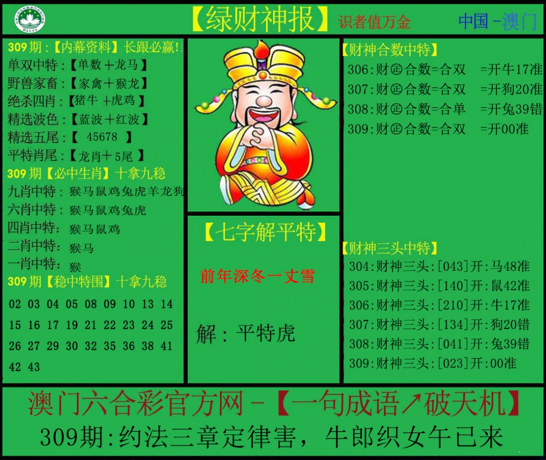 | 309期必中二肖:狗虎 | 309期必中③码:32.44.16 |
