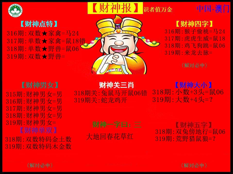 | 315期: 买啥都中 【地肖地肖地肖】开:虎04准 |