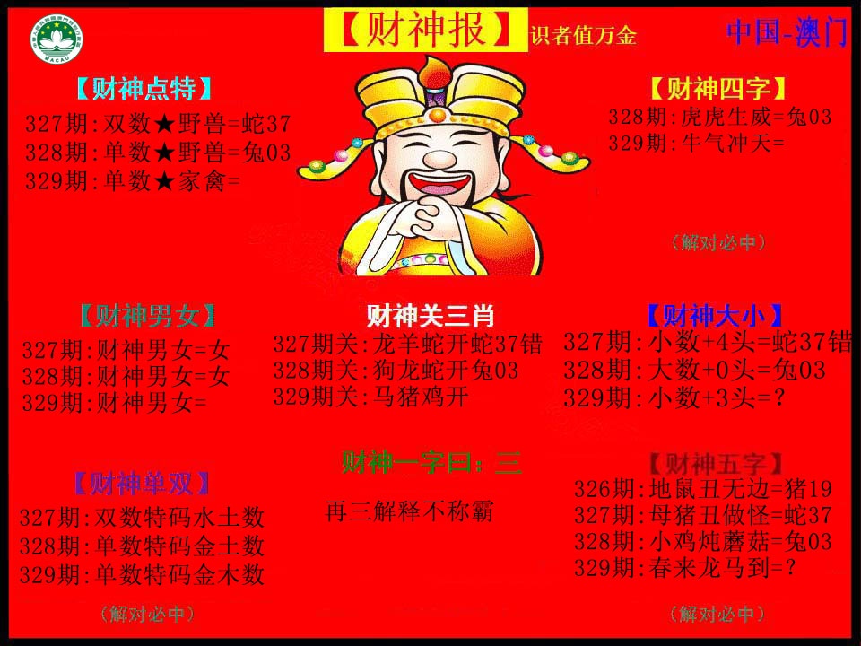 | 329期: 买啥都中 【女肖女肖女肖】开:?00准 |
